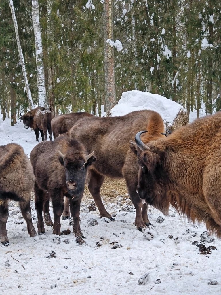По дороге нас встретили сотрудники Дирекции особо охраняемых природных территорий Владимирской области (далее – ООПТ), и мы уверенно пошли к главной точке нашего путешествия – месту кормления вольной популяции беловежских зубров. Проходя по маршруту экологической тропы, мы узнали историю появления зубров в заказнике, познакомились с флорой и фауной Клязьминско-Лухского заказника, изучили следы животных и птиц на снегу, узнали, как «работает» желна (черный дятел) и почему кусты дерева «обрублены» (оказывается, лось постарался). Особенно впечатлила нас история черного аиста Кузи, которого сотрудники ООПТ этим летом выпустили на волю. Дорога показалась нам настолько длинной, что мы неустанно задавали вопросы: а где же, а когда же зубры?🦬 И наконец, мы увидели огромных животных, которые свободно разгуливают на заповедных просторах. От экскурсовода мы узнали, что в стаде царит матриархат. И тут же в этом убедились, когда увидели, как главная зубриха Красотка отогнала всех, кто решил поесть зерна из одной с ней кормушки. Посчастливилось нам увидеть и старожила Рыжика, который более 25 лет живет в заповеднике и считается самым старым. Его величественный вид впечатляет! Диаметр рогов у основания больше 30 см точно! Не обошлось и без выяснения отношений у великанов русского леса: как легко поднимает один другого на рогах! О том, что между ними часто бывают схватки боевые, говорят сломанные рога у некоторых особей или вовсе их отсутствие и не только! В стаде есть зубриха без хвоста! О том, где она его «потеряла», история умалчивает, к сожалению…