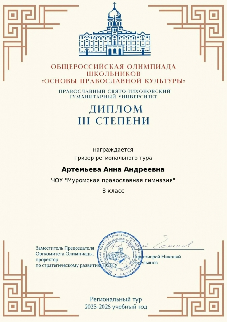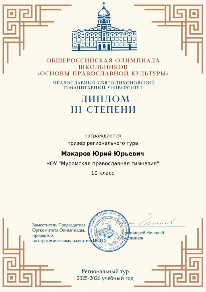 2 февраля 2026 года прошел региональный тур олимпиады по Основам православной культуры среди учащихся православных гимназий и общеобразовательных школ Владимирской епархии, в котором приняли участие 16 ребят нашей гимназии.